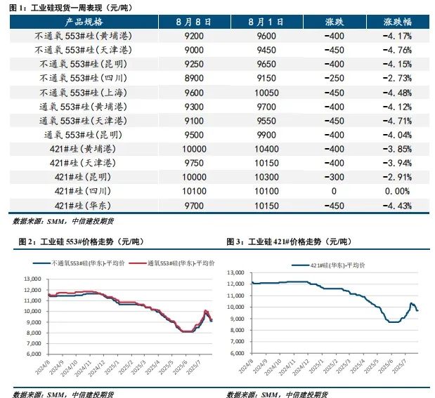 现货市场方面,尽管期货市场有所反弹,但由于前期现货价格整体偏高,尚未跟上期货价格下跌步伐,因此本周现货价格仍在回调,呈补跌的态势。尽管部分地区存在挺价现象,但工业硅近期供应持续增加,现货价格保持坚挺仍然艰难。